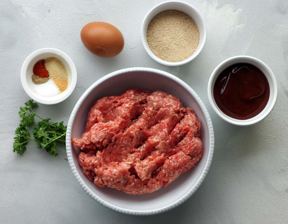 Das Hackfleisch in eine Schüssel geben. Paniermehl mit Ei und Milch verrühren, obenauf geben. Die Gewürze und 50 g BBQ-Sauce dazu geben, alles zu einer glatten Masse verkneten oder verrühren (nicht zu lange).