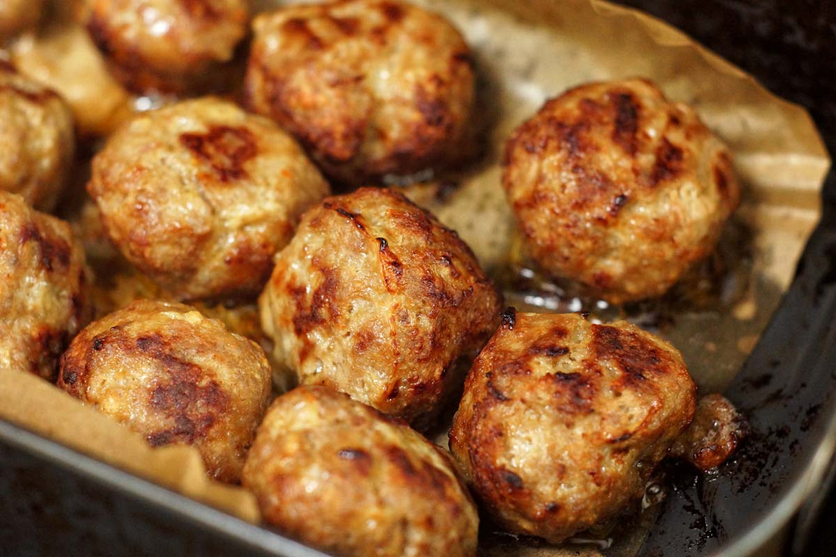 Airfryer auf 190 Grad vorheizen, den Korb mit einem Blatt Backpapier auslegen. Aus der Hackmasse mit nassen Händen etwa 15 - 18 Bällchen zu je 45 g formen (ja, ich wiege das ab, damit alle Meatballs gleich groß sind und exakt die gleiche Garzeit haben). Mit Abstand auf das Backpapier legen (notfalls in zwei Partien arbeiten).