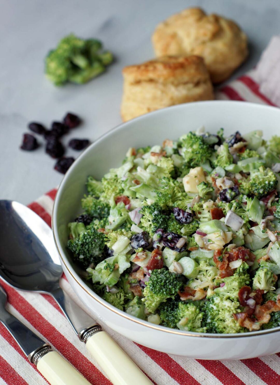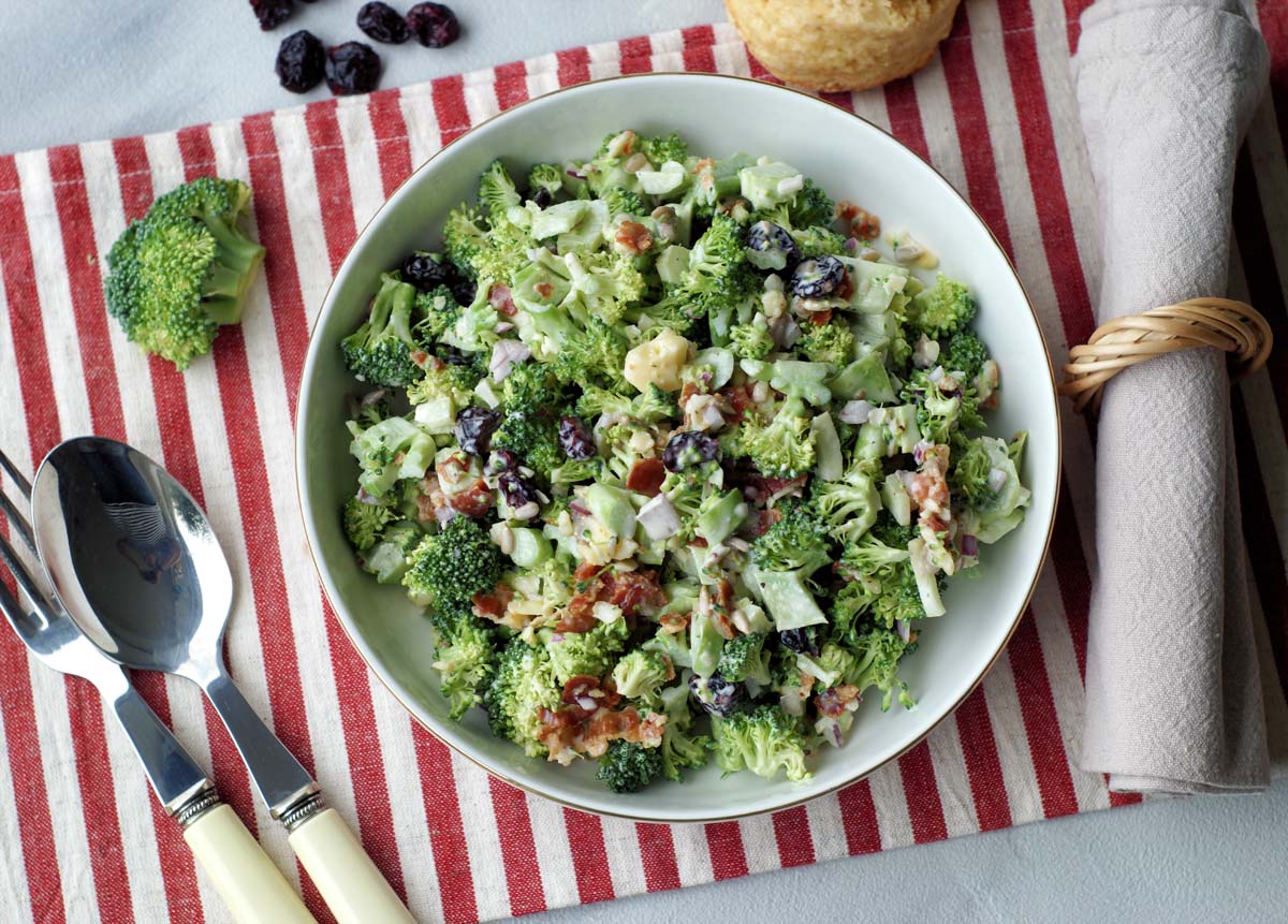 Dieser Beilagen-Salat vereint knackig (Brokkoli und Sonnenblumenkerne), cremig (Käse und Dressing), salzig (Speckwürfelchen) und süßlich (Cranberries). Dabei ist er supereinfach zu machen und hält sich sehr gut.