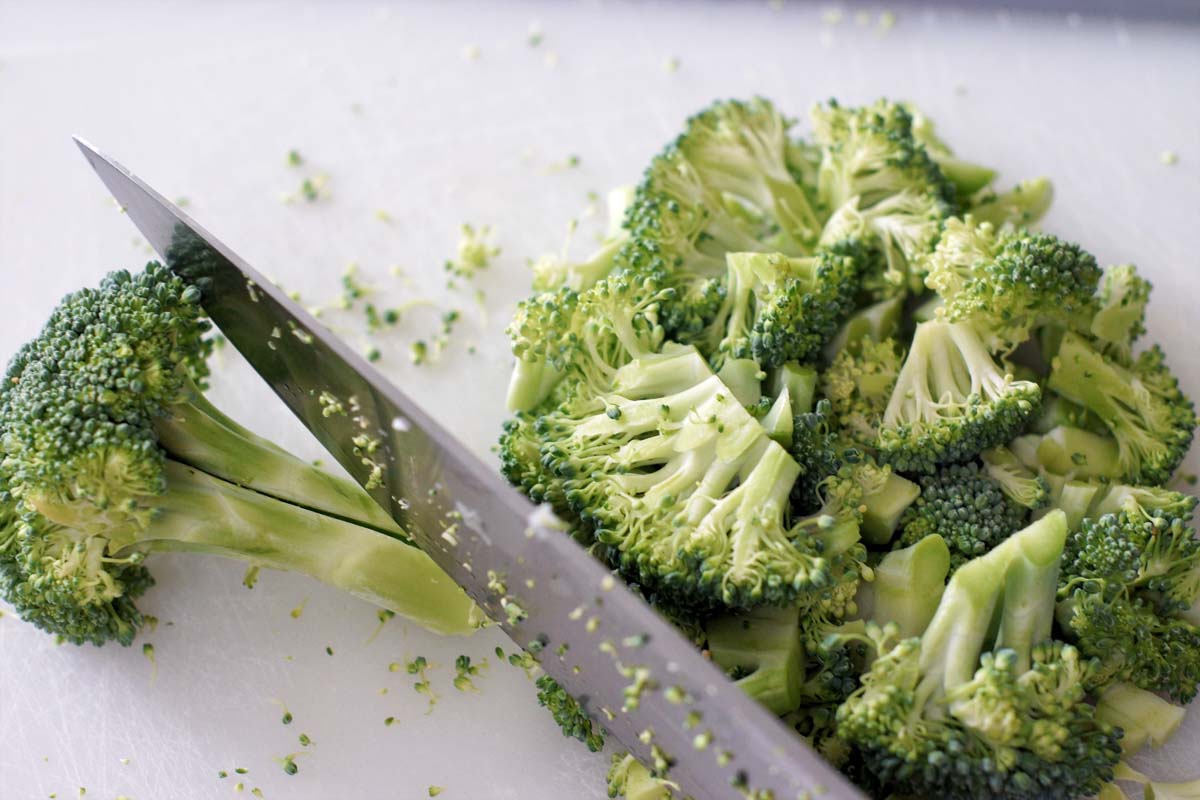 Den Broccoli putzen, in Röschen teilen, den Stiel schälen. Alles in mundgerechte Stücke hacken, möglichst nicht größer als 5 x 5 mm.