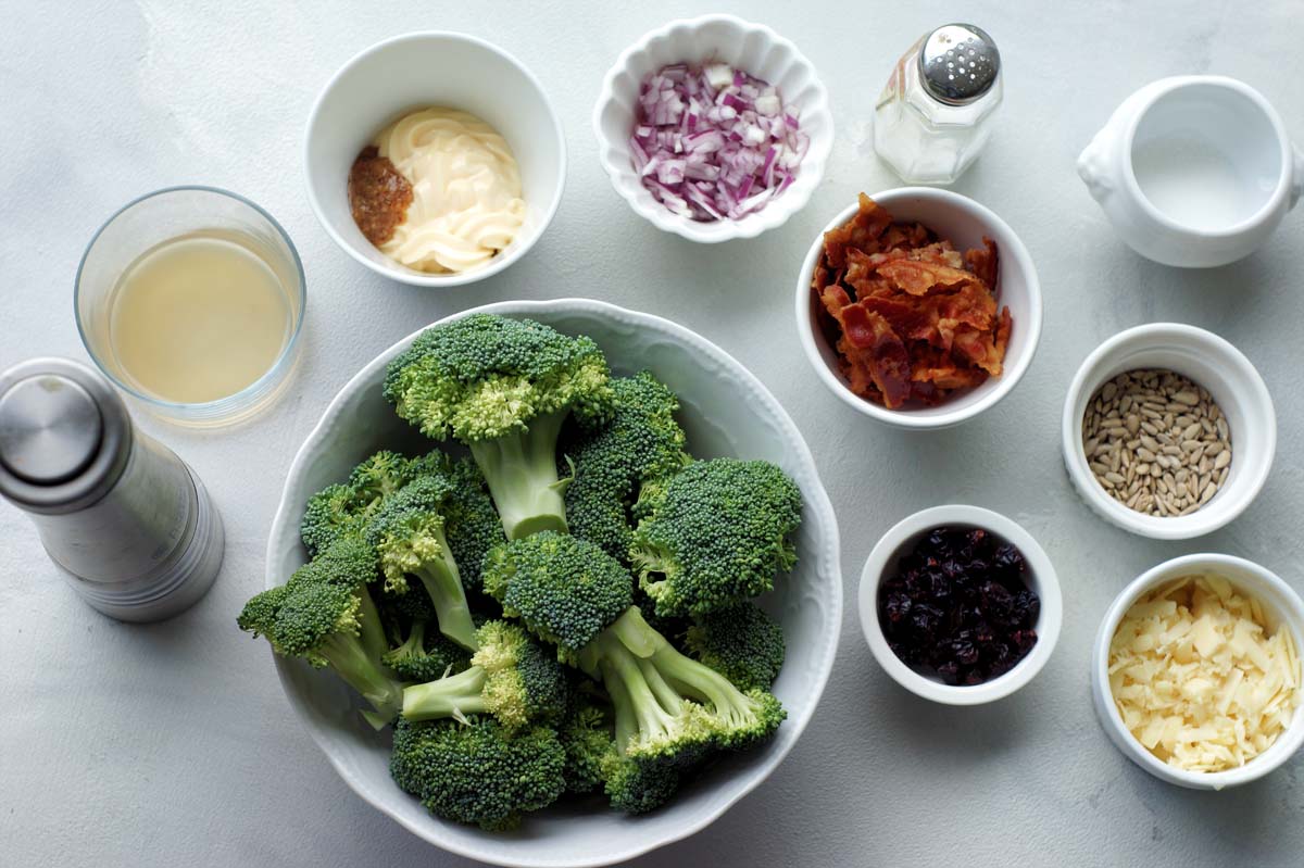 Da musste ich doch tatsächlich 60+ Jahre alt werden, um diesen Salat zu entdecken: Brokkoliröschen, knackige Sonnenblumenkerne, süßliche getrocknete Cranberries, ein süß-sauer-cremiges Dressing – hmm! Dass zusätzlich knusprige Speckstückchen und würzige Käsebröckchen drin sind, schadet auch nicht. Falls ihr Veganer mit am Tisch habt, könnt ihr diese beiden Zutaten natürlich weglassen oder auf die entsprechenden veganen Ersatzprodukte ausweichen. Auch die Mayonnaise sollte dann natürlich vegan sein.