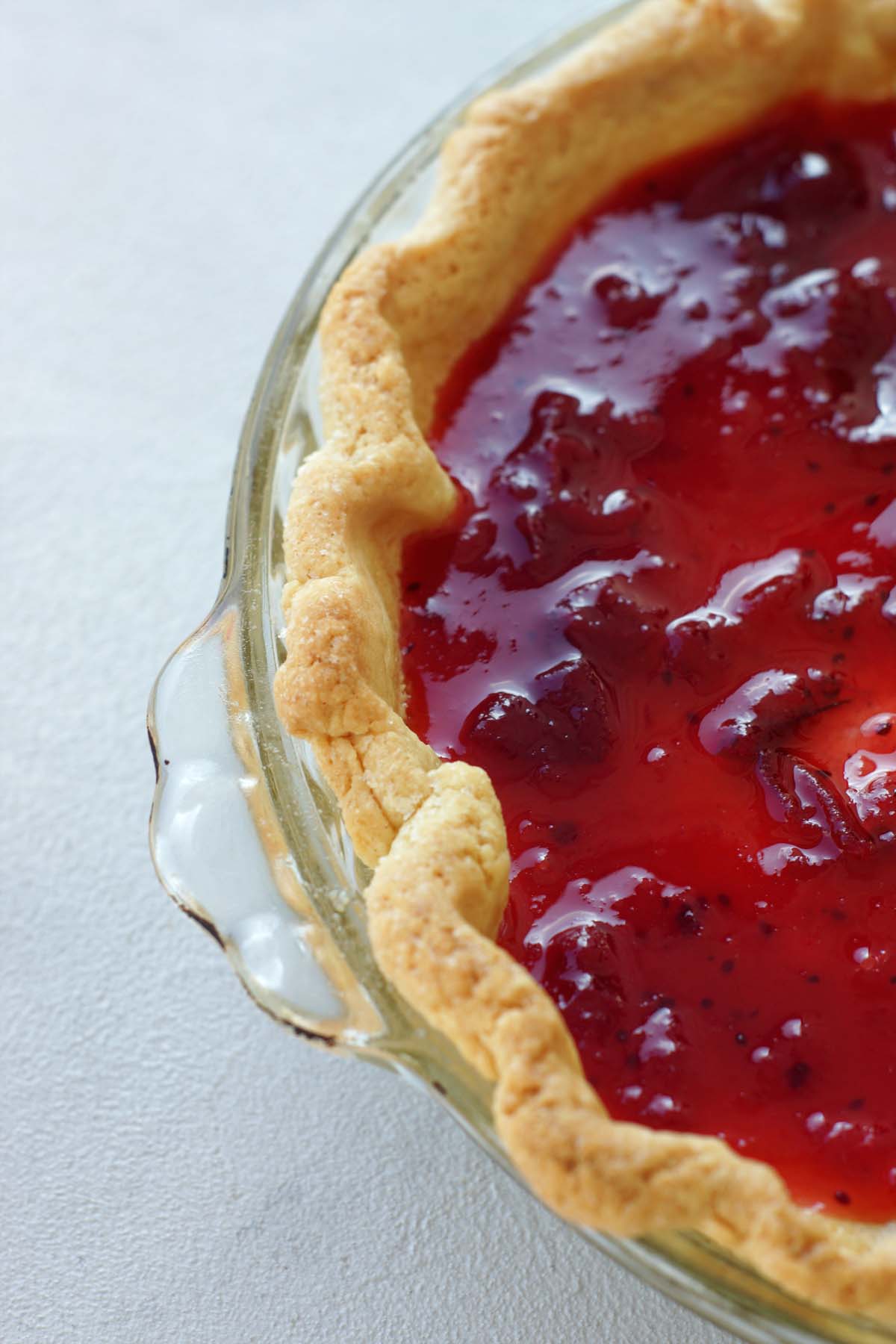 Ein Kuchen zum “ratzfatz-mal-eben-nebenher-backen” ist das (leider) nicht. Da müsstet ihr eher Blitzbrownies oder Berry Coffee Cake wählen 😉 Hier geht es leider nicht ohne den Boden vorzubacken, damit er auch wirklich knusprig am Rand bleibt. Was dieses Blindbacken ist, habe ich im Rezept für Banana Cream Pie genau beschrieben. Es sorgt dafür, dass Boden und Rand richtig durchgebacken sind, bevor die Frischkäse-Eggnog-Creme eingefüllt wird. Die wird dann nochmals gebacken, und zwar bis die Füllung fest ist, aber in der Mitte noch leicht “wabbelt”. Backt ihr zu lange, kann die Schicht später einreißen. In jedem Fall kommt das Fruchttopping erst ganz am Ende auf den lauwarmen Kuchen.