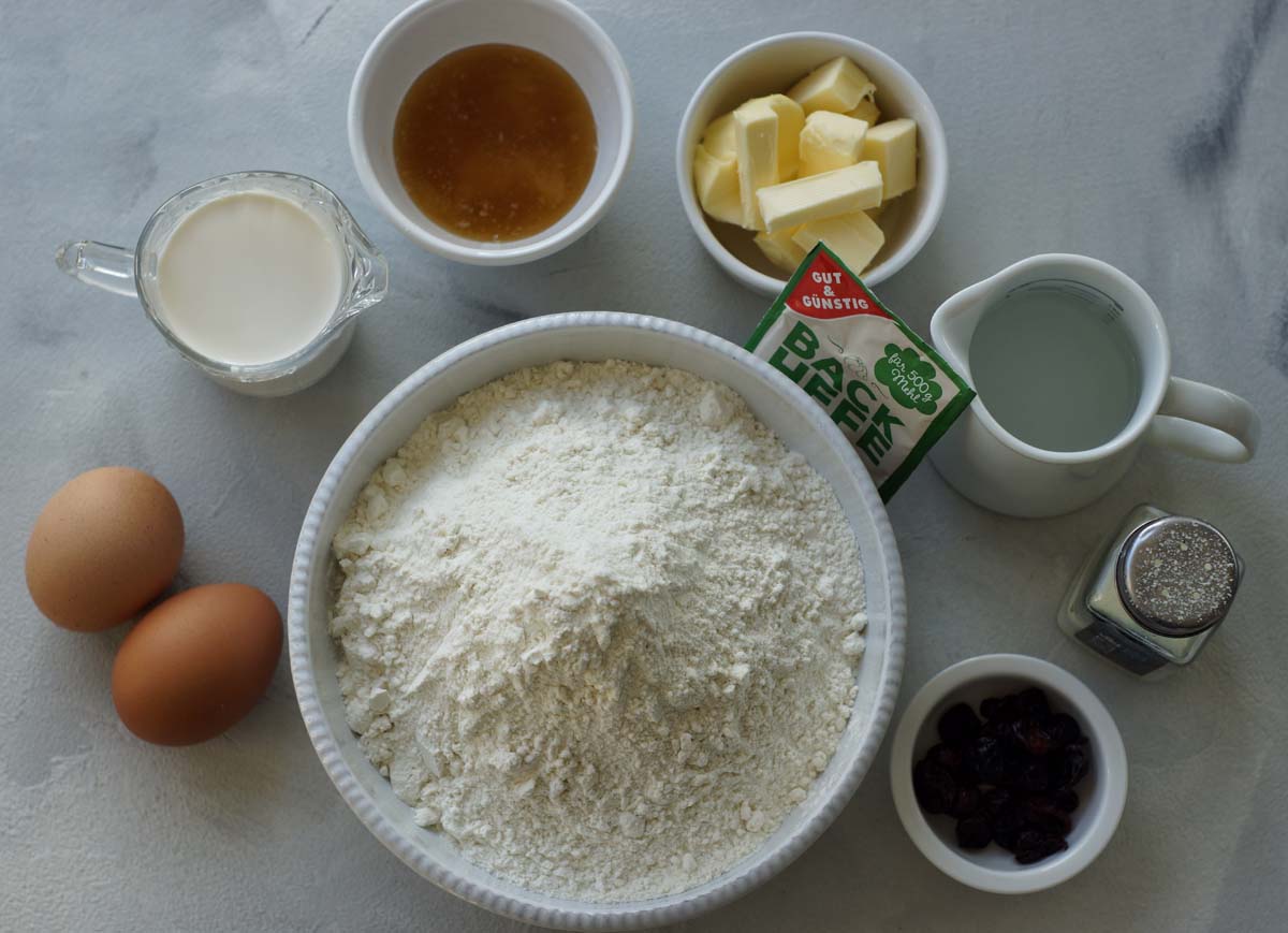 Kondensmilch, Honig, Butter und 60 ml von dem Wasser erhitzen, bis es höchstens lauwarm ist. In die trockenen Zutaten geben und unterrühren. Ei untermischen und mit den Knethaken des Mixers oder der Küchenmaschine etwa fünf Minuten lang zu einem Teig kneten. Ist der zu fest, schluckweise das das zurückbehaltene Wasser dazu geben. Am Ende sollte der Teig nicht am Schüsselrand kleben, aber sich gut formen lassen.