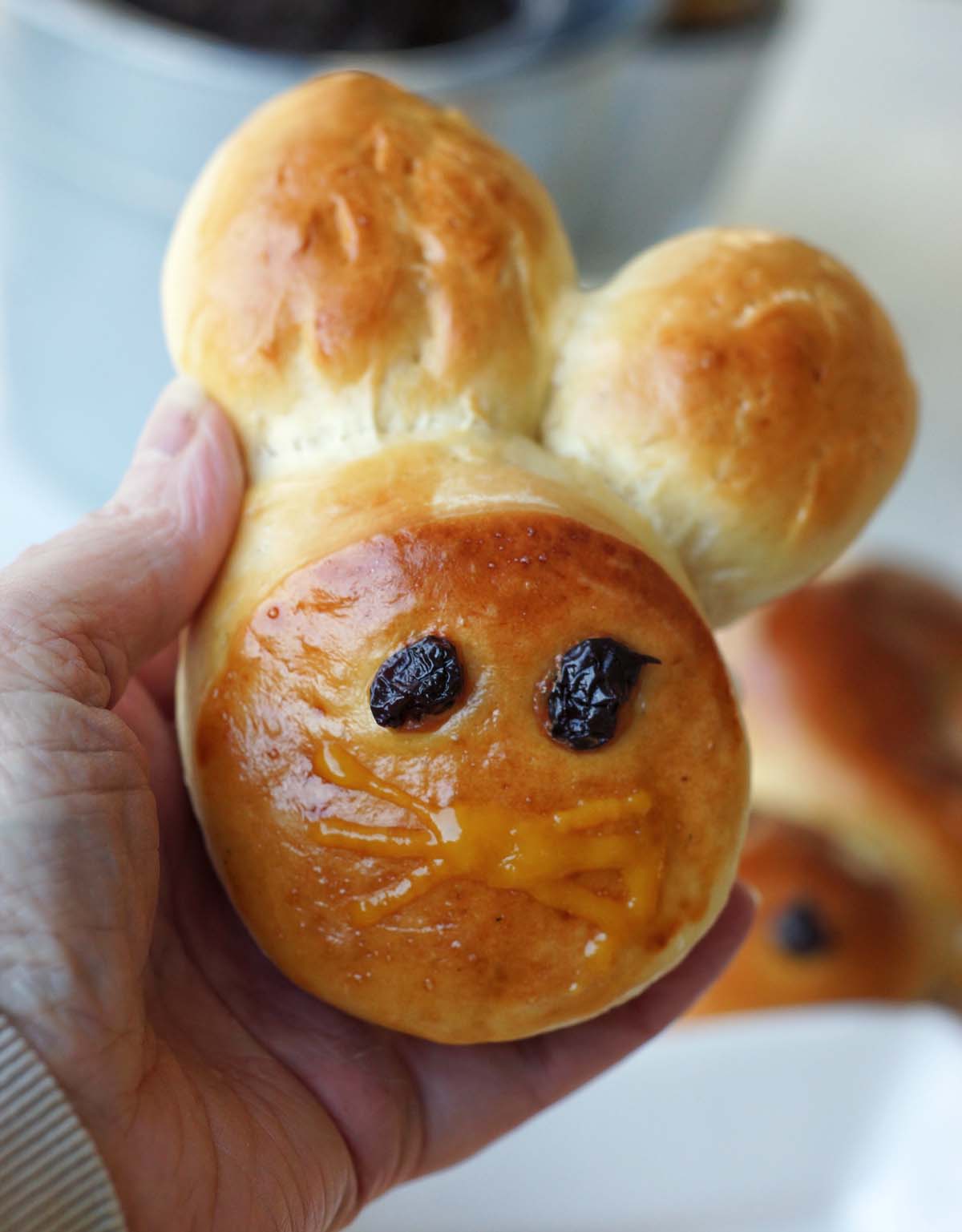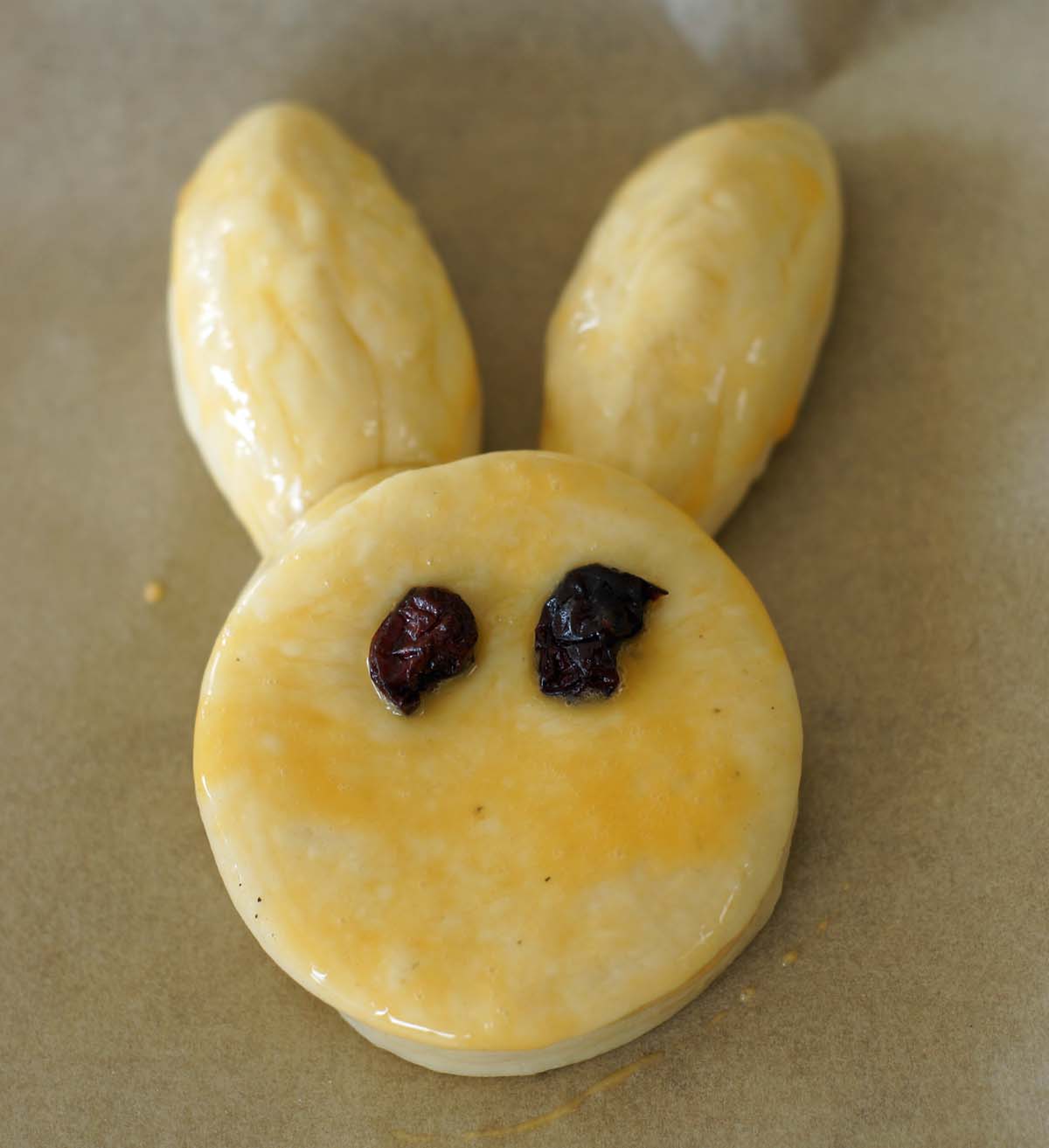 Kreise auf ein mit Backpapier belegtes Blech legen, jeweils zwei Ohren unter ein "Gesicht" legen. Mit Ei bestreichen, zwei Rosinen als Augen eindrücken.