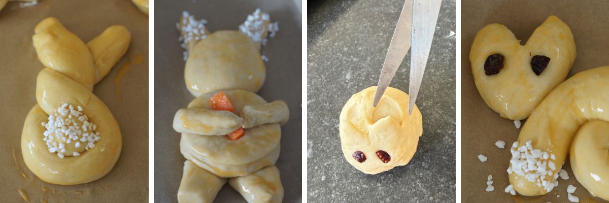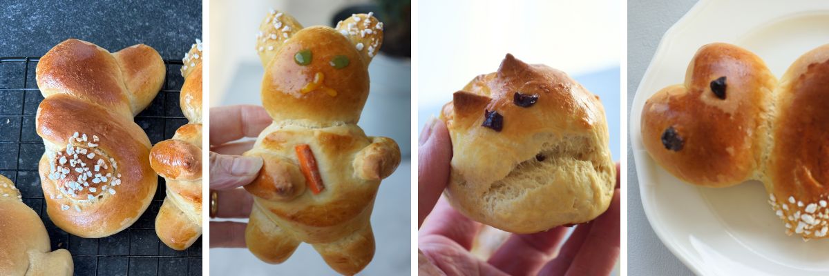 Wie ihr seht: Ich habe Seile, Bären, Kugelfische und Fantasiewesen (v.l.n.r.) produziert 🙂 Lediglich die Hasenkopf-Form auf dem Foto unten darf sich guten Gewissens zur Gattung Honey Bunny Rolls zählen. Die Zubereitung der anderen Alternativen führe ich also nicht auf in meinem Rezept. Aber verratet mir gerne, wenn ihr woanders noch schöne Osterhäschen gesehen habt. Ich habe zum Beispiel auch noch die ausgestochenen Osterhäschen von Backen macht glücklich auf der Liste.