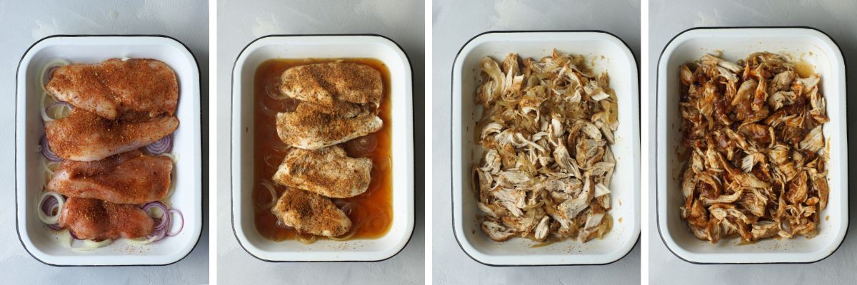 Die Zwiebelringe in den Einsatz des Slowcookers (3,5-l-Topf) geben. Das Hühnchenfleisch mit dem BBQ-Gewürz einreiben und obenauf legen, Flüssigkeit angießen.