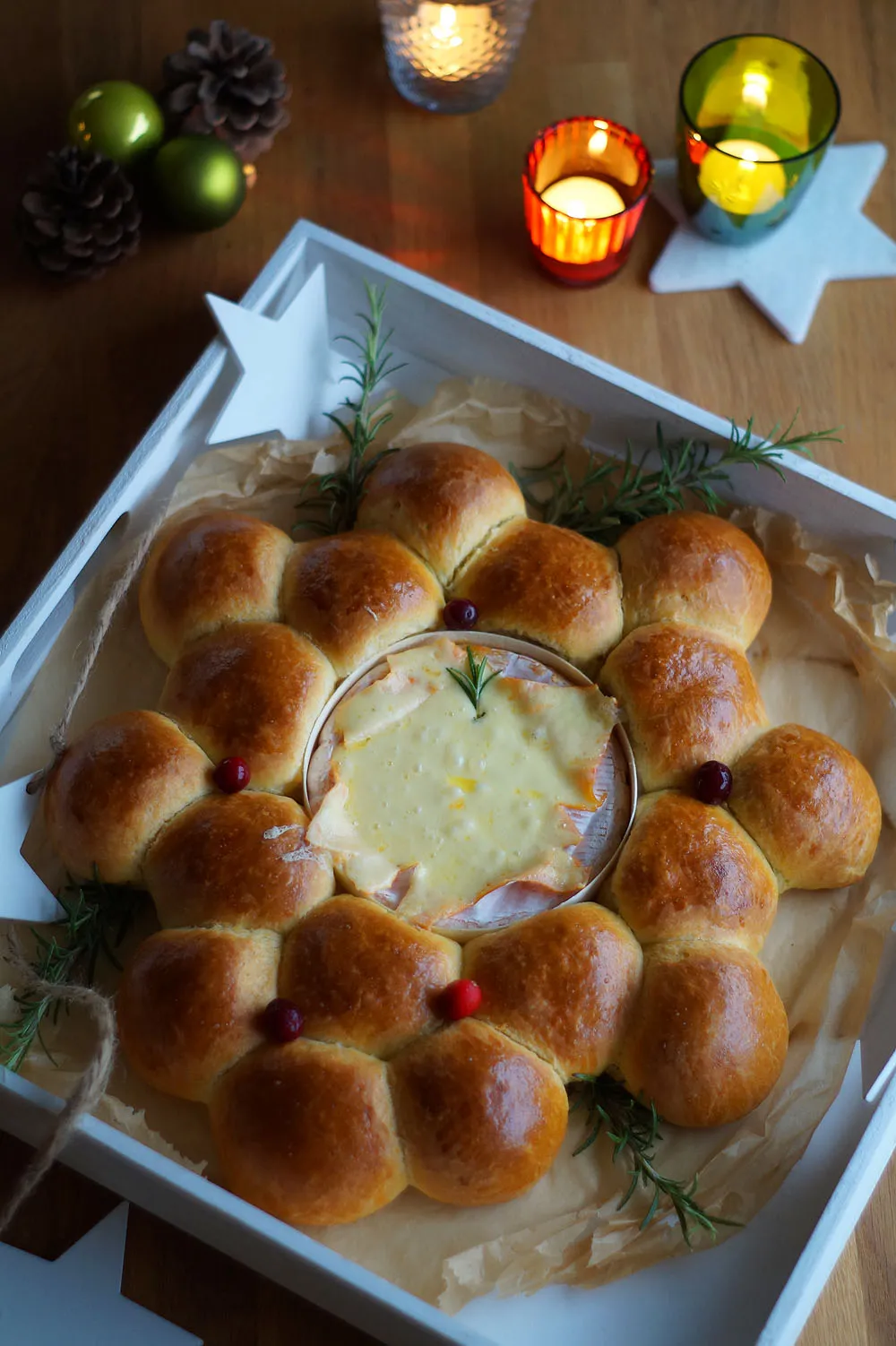 Dieser essbare Adventskranz besteht aus luftigen Brötchen, einem herzhaften Ofenkäse in der Mitte und Preisselbeerdip. Das Ganze sieht auch nett und weihnachtlich aus – stellt euch das einmal als “Knabberzeug” auf der Weihnachtstafel vor, vielleicht zum Christmas Wreath Snackboard mit Käse, Wurst und Oliven? Hübsch, oder? Und lecker auch – einfach ein Brötchen abzupfen und in den Käse tauchen, der so herrliche Fäden zieht. Dann noch ein Klecks Preisselbeeren obenauf…